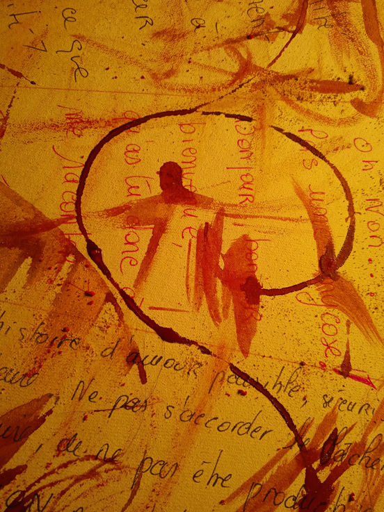 Chaque mois pendant un an, nous avons clôturé chacun de mes cycles en déposant mon sang sur les mots de mes carnets d’écriture. J'ai laissé naître sous mes doigts : univers, personnages et mouvements. Une façon pour moi d’accueillir et de respecter ce fluide. Nicolas photographiait ces images en même temps qu’elles prenaient vie.